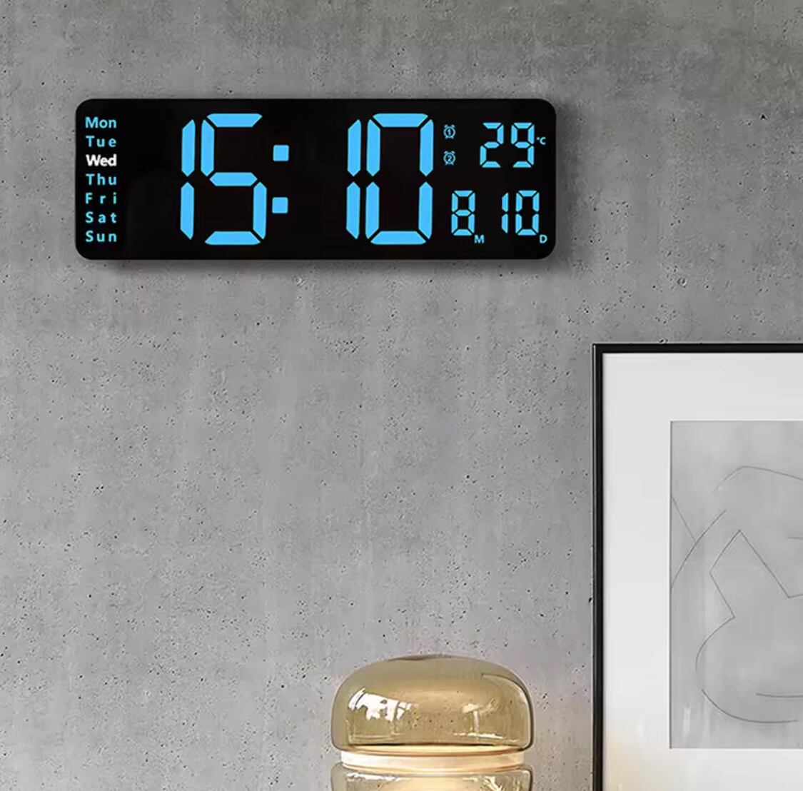 シンプルなデザインが特徴で、明瞭なデジタル表示を提供しています。サイズは軽量な仕様で、壁に掛けるだけでお部屋の雰囲気を一新します。クリアな表示とスリムなフレームが、現代的かつ洗練された印象を与え、リビングやオフィスにぴったりです。日付表示や温度計機能も搭載しており、便利さとおしゃれさを兼ね備えたアイテムです。