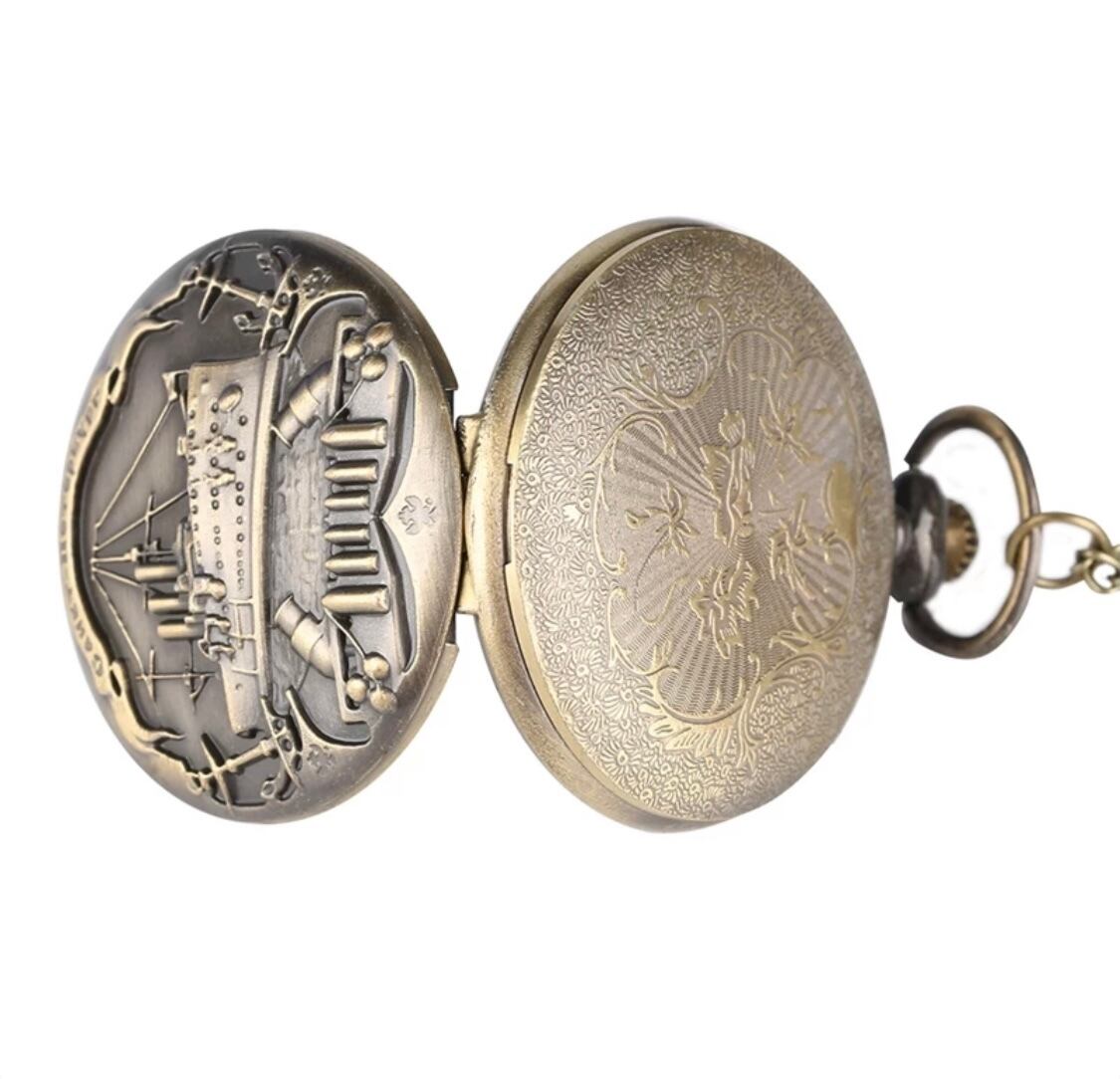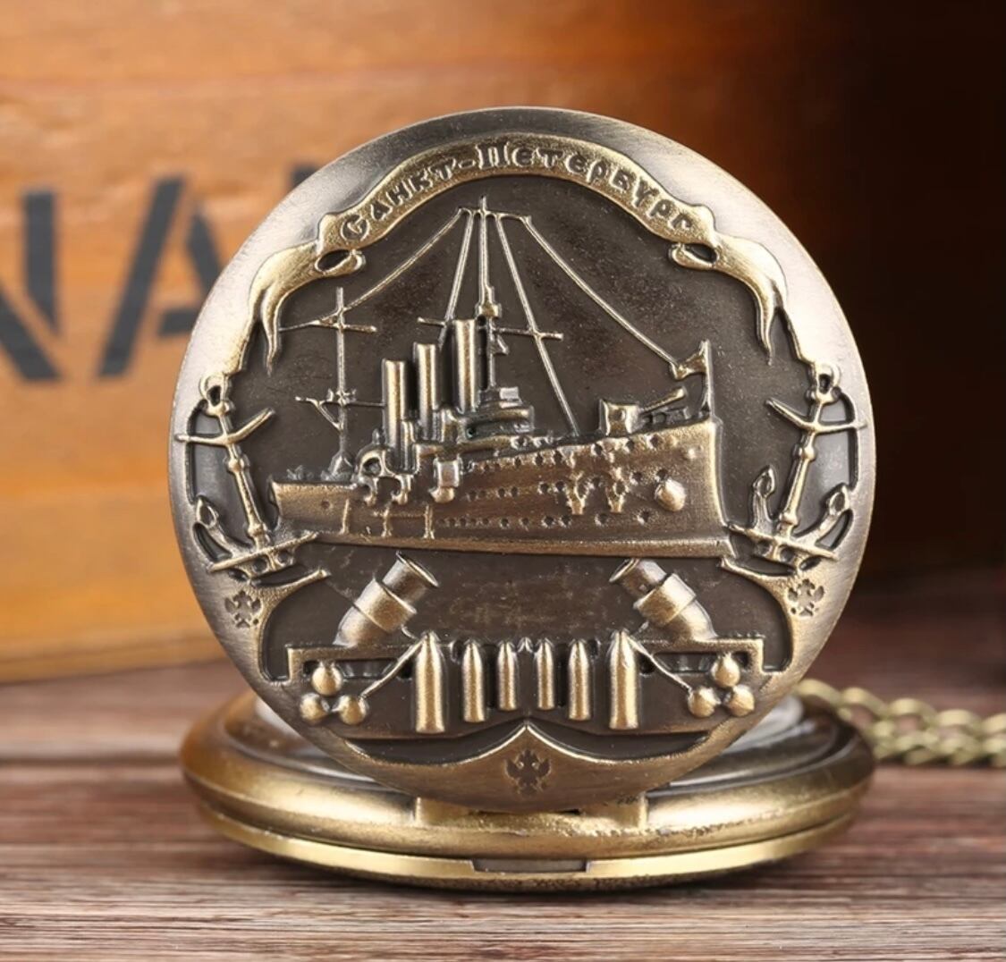 独特な軍艦デザインが特徴で、ブロンズ素材を使用した高級感溢れる仕上がりです。クォーツムーブメントを搭載しており、正確な時間をお届けします。ネックレスチェーンが付属しているため、ファッションアイテムとしても活躍し、どんなスタイルにも合わせやすいのが魅力です。